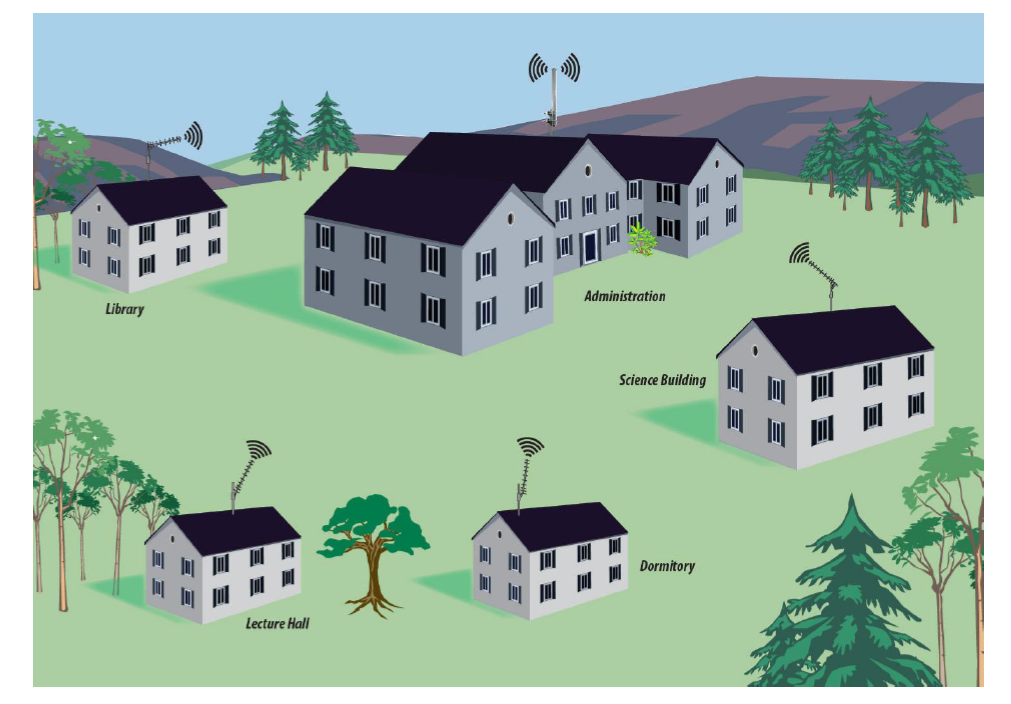 在這種情況下,您可以在中央建筑物上使用多個(gè)定向天線和全向天線來(lái)連接校園中的建筑物。這被稱為點(diǎn)對(duì)多點(diǎn)網(wǎng)絡(luò)。與任何室外WiFi網(wǎng)絡(luò)一樣,清晰的站線至關(guān)重要。此外,必須適當(dāng)?shù)貙?duì)準(zhǔn)天線,以確保最佳的信號(hào)質(zhì)量。